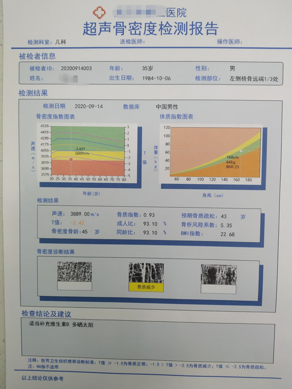 骨密度測量將提供全身或任意骨的骨密度值,并將測得的骨密度值與正常人的骨量峰值比較得出T值。