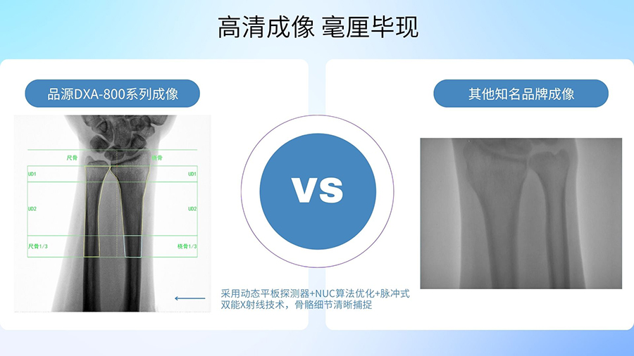搭載錐形束面成像技術(shù)與高靈敏數(shù)字平板探測器,突破傳統(tǒng)線掃描局限,4 秒內(nèi)完成前臂高清成像,清晰呈現(xiàn)尺橈骨遠(yuǎn)端微觀結(jié)構(gòu),圖像細(xì)膩。配合NUC 非均勻性校正算法,實(shí)時(shí)修正圖像亮度不均與噪點(diǎn)干擾,讓骨骼邊緣等細(xì)節(jié)毫厘畢現(xiàn),為醫(yī)生提供清晰可靠的診斷依據(jù)。