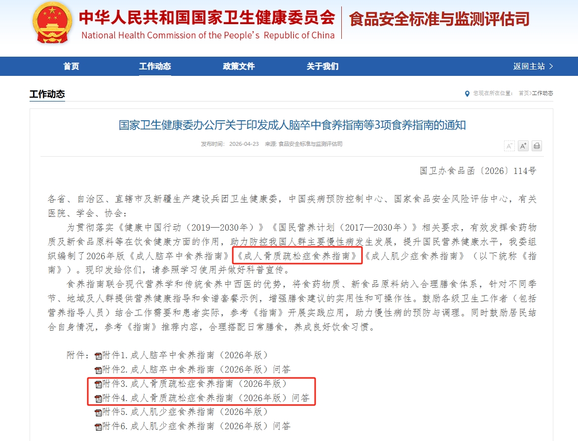 為貫徹落實《健康中國行動(2019—2030年)》《國民營養(yǎng)計劃(2017—2030年)》相關(guān)要求,有效發(fā)揮食藥物質(zhì)及新食品原料等在飲食健康方面的作用,助力防控我國人群主要慢性病發(fā)生發(fā)展,提升國民營養(yǎng)健康水平,2026年4月23日,國家衛(wèi)生健康委辦公廳印發(fā)通知,正式發(fā)布《成人腦卒中食養(yǎng)指南(2026年版)》《成人骨質(zhì)疏松癥食養(yǎng)指南(2026年版)》《成人肌少癥食養(yǎng)指南(2026年版)》3項成人專項食養(yǎng)指南。