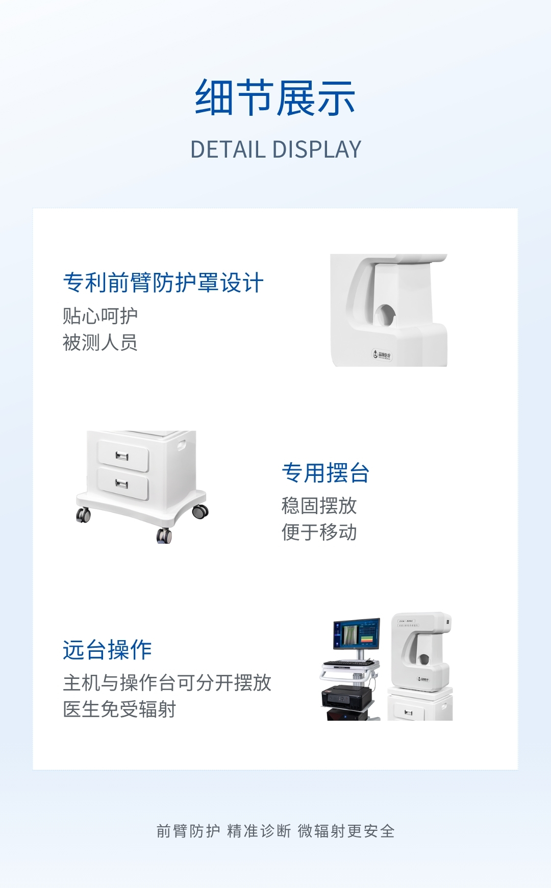 1、低射線,微劑量:DXA- 800E 雙能 X 線骨密度儀,被測人員檢測一次受到的劑量相當于曬太陽 20 分鐘劑量,幾乎可以忽略不計。
